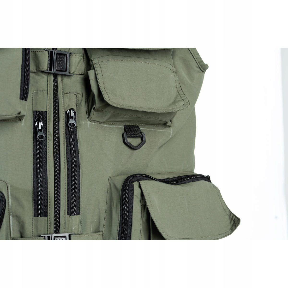 Posiada dużą ilość kieszeni, kieszonek oraz karabińczyków na różne akcesoria wędkarskie.
